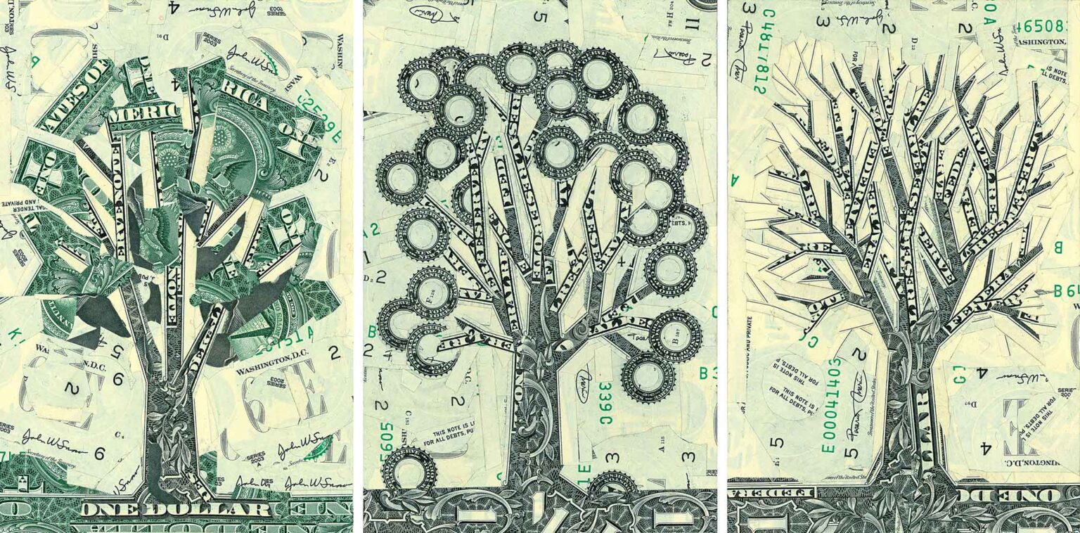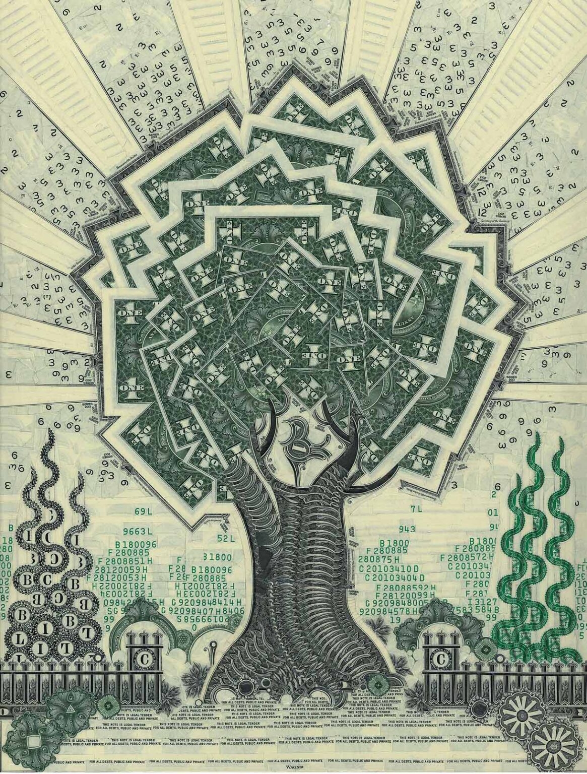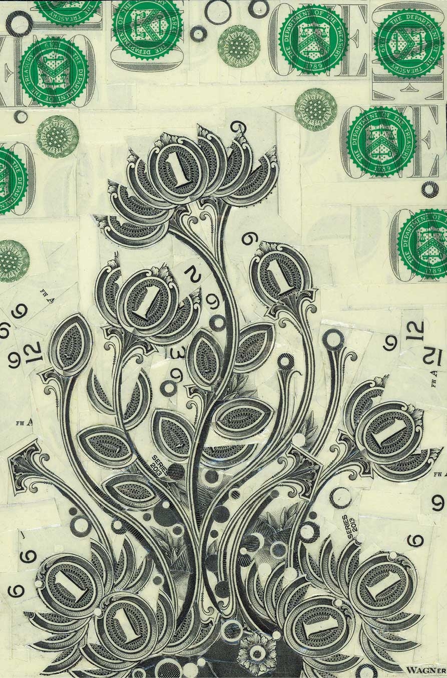 關於本文藝術作品/拼貼藝術家馬克.瓦格納(Mark Wagner)將美元紙鈔解構,以此創作繁複的藝術作品。