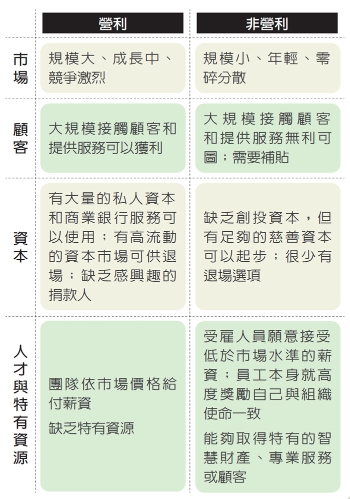 如今,營利事業與非營利組織之間的界線愈發模糊。營利事業能以嘉惠社會的方式經營,非營利組織也能提供極具市場競爭力的產品。帶有社會使命感的創業者,應盡早確定自己的新創企業屬於何者,以避免後續的經營難題。