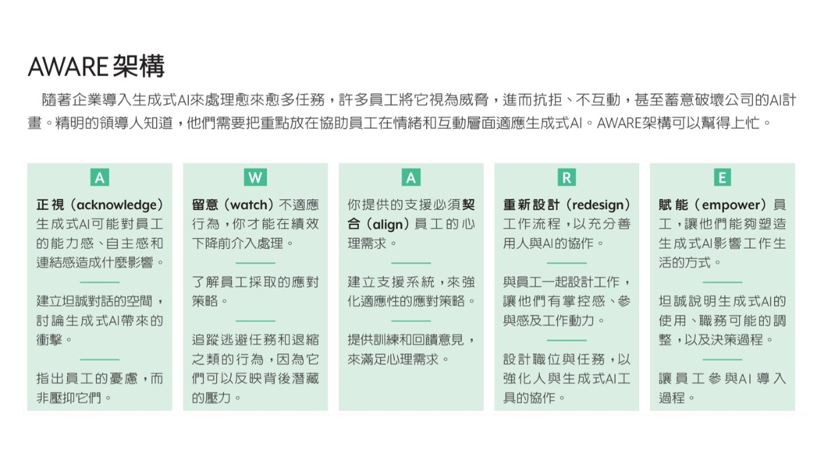 解決方案:運用AWARE架構將生成式AI整合到工作上,正視(acknowledge)員工的憂慮,留意(watch)員工在面對生成式AI時出現哪些不適應的行為,讓支持系統契合(align)員工的需求,以AI與人類的綜效為目標來重新設計(redesign)職位,並以坦誠和包容來賦能(empower)員工。