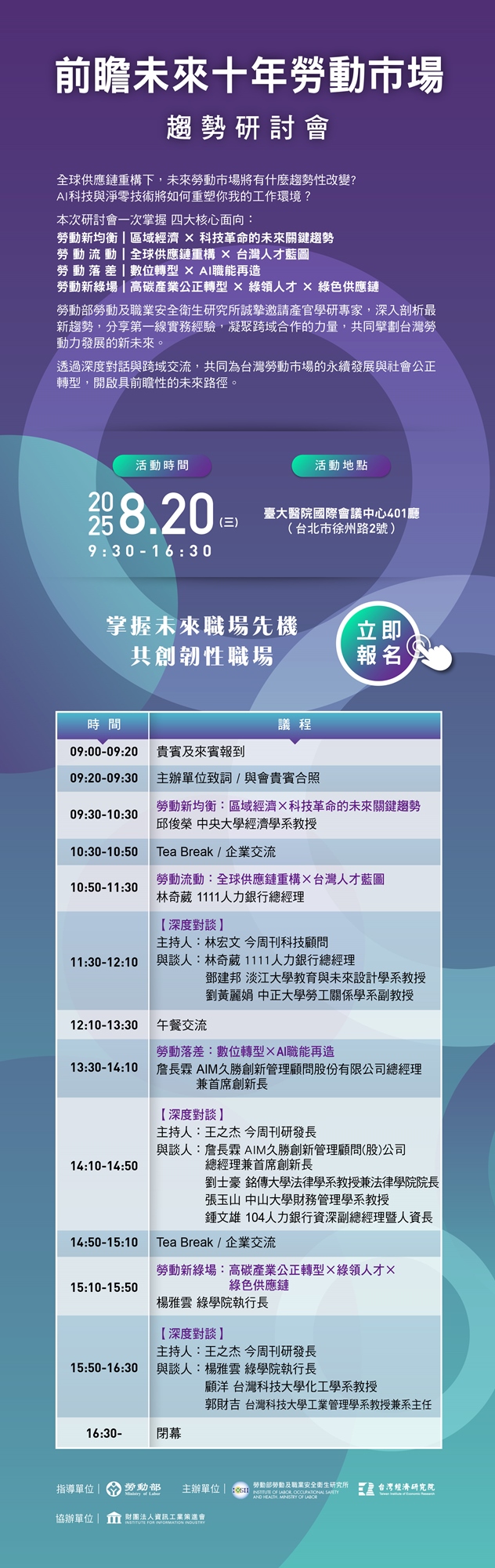 產官學研專家深入剖析最新趨勢,分享第一線實務經驗,凝聚跨域合作力量,為台灣勞動市場永續發展與社會公正轉型,開啟具前瞻性的未來路徑。