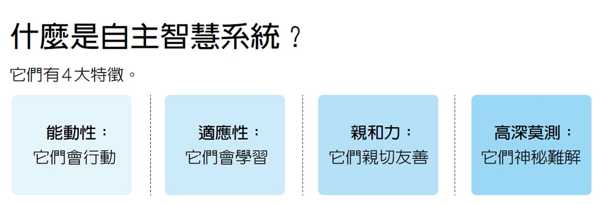 自主智慧系統雖然仍處在萌芽階段,卻展現出4大特徵:能動性(它們會行動)、適應性(它們會學習)、親和力(它們親切友善)、高深莫測(它們神秘難解)。這些特徵有助於我們了解應如何正確地接近它們,以及它們將如何與從何發揮日益強大的力量。我們逐一來看看這些特徵。