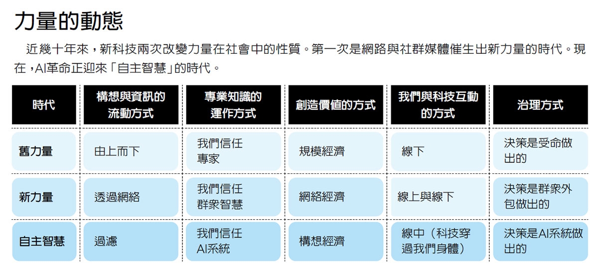 這個新時代的巨大挑戰,將是找到強化人類能動性的方法,而不是讓它收縮或退化。20年前進入新力量的時代,我們允許新科技平台滲入世界所有層面,但我們沒有先去了解它們的創造者有什麼真實意圖、是什麼讓這些科技如此強大,以及它們會對我們的生活方式、工作方式與互動方式造成多少根本的影響。如今,當我們進入新時代,必須抱著兩個清楚而嚴肅的認知:首先,我們不應該把自主智慧系統視為工具,而是行動者,它們帶來了各種機會與風險;第二,推動這種轉變的科技公司無論公開標榜什麼理念,它們的動機與我們其他人根本不同。