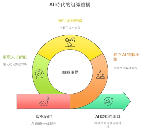 不要讓 AI 專案被困在資訊部門。成立一支直接向 CEO 報告的特戰小組,其任務是全面解構流程,重新設計 AI 時代的最佳組織藍圖。這不只是導入工具,而是重塑企業神經系統的工程。